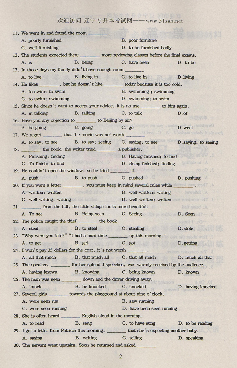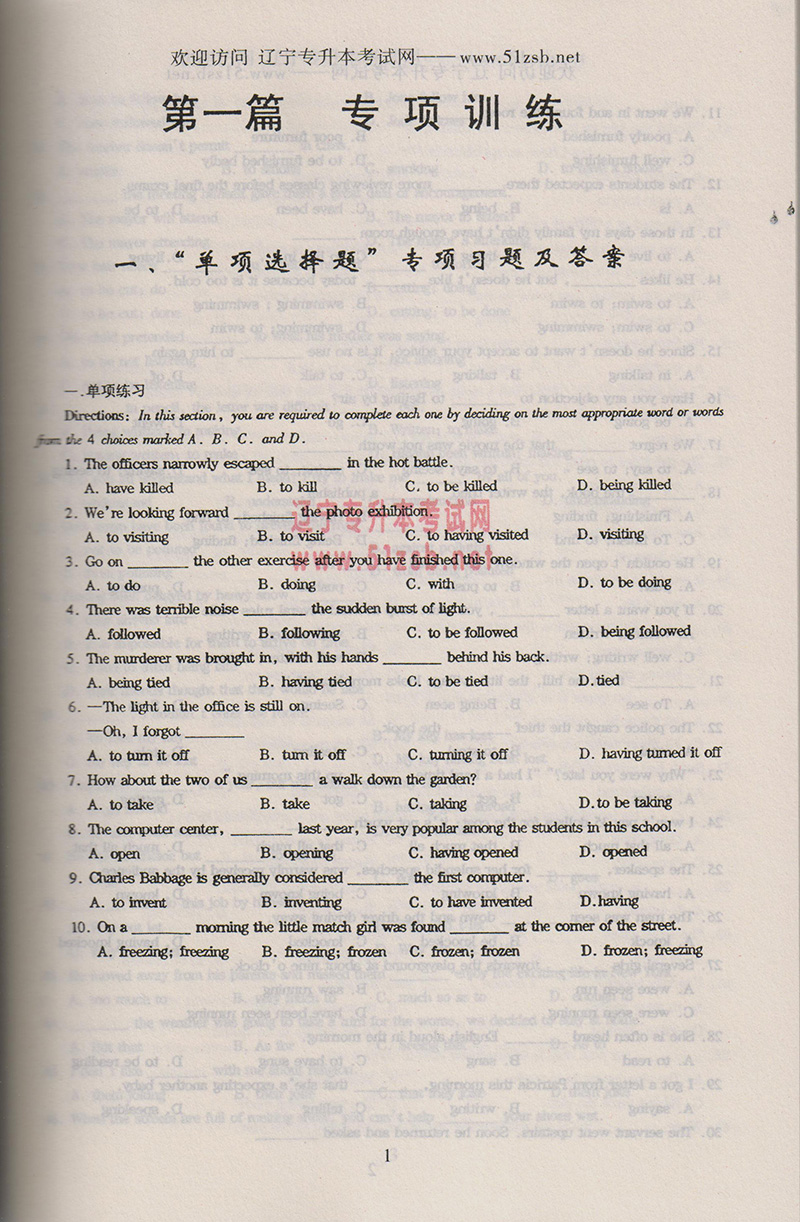 試題的考查目標(biāo)明確,重點(diǎn)難點(diǎn)突出,本試題涵蓋專(zhuān)升本考試的所有題型,試題配有答案解析。英語(yǔ)只有在具備一定單詞量的基礎(chǔ)上大量做題,記憶才能取得高分。